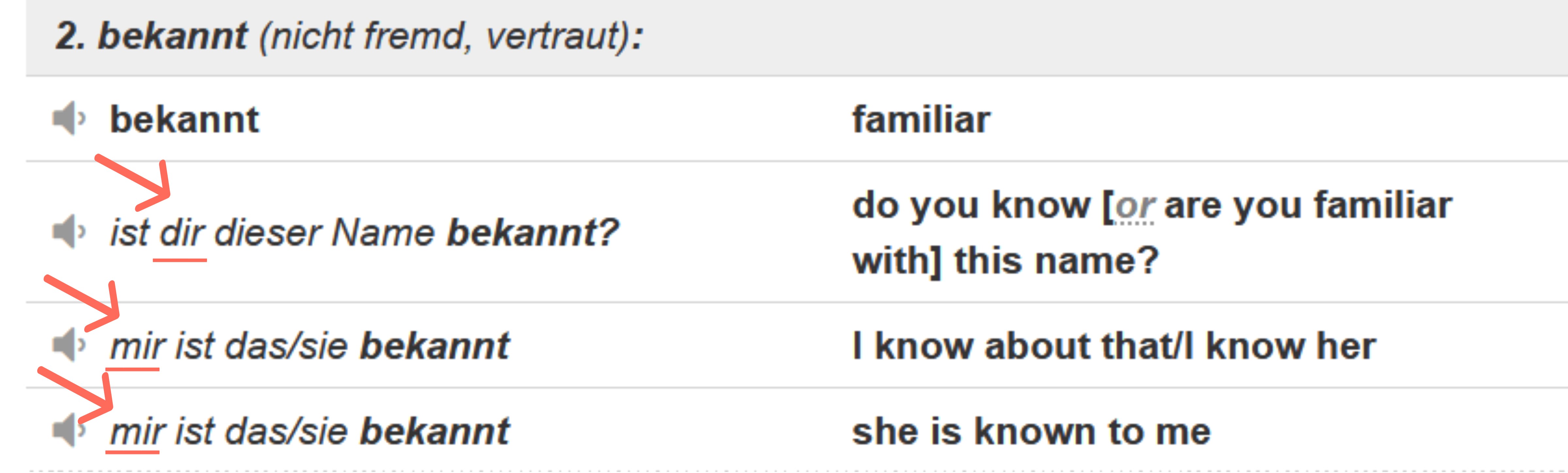→ What this dictionary entry shows, is that you have to scroll down to information number "2.". By recognizing that the pronouns "dir" (to you) and "mir" (to me) are used in their Dative forms, you will have the key to using this combo correctly. You will find similar entries for all adjectives with the Dative case.