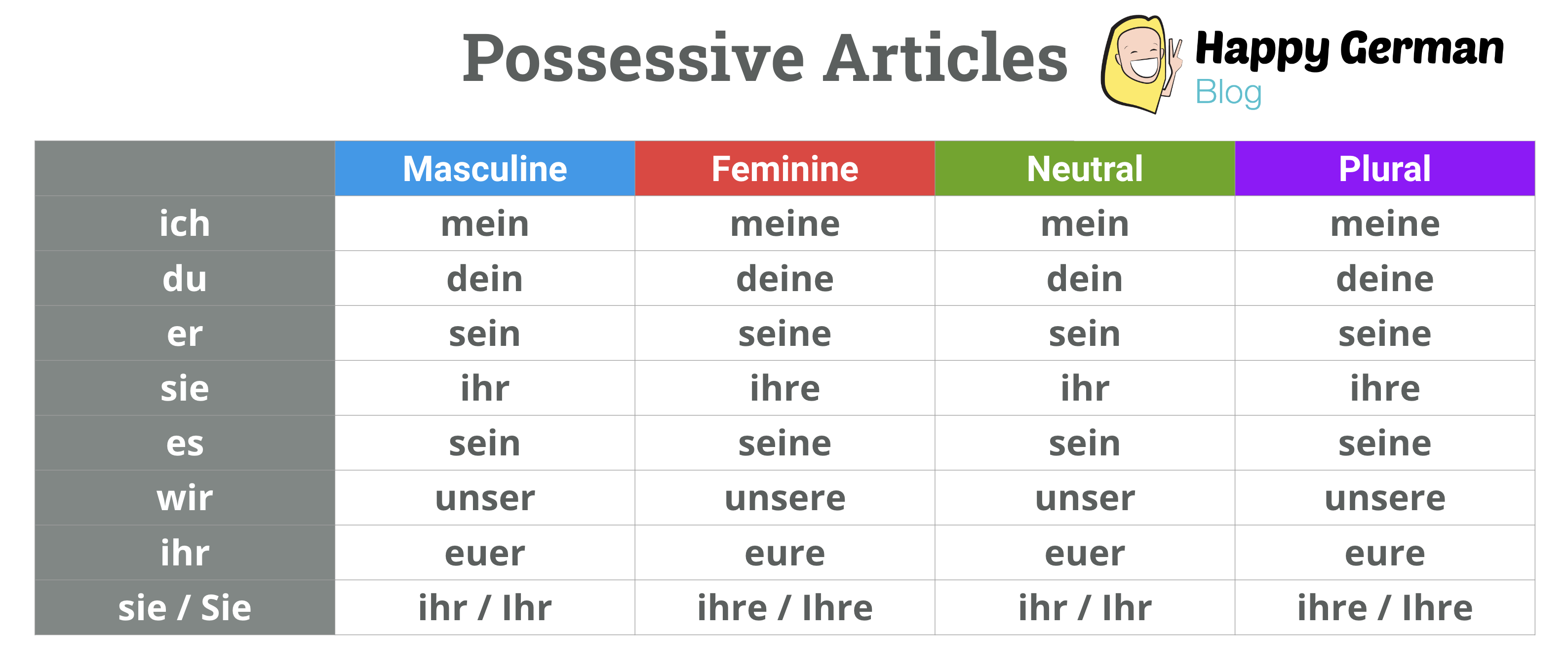 Here’s a table with all the German possessive articles at a glance.